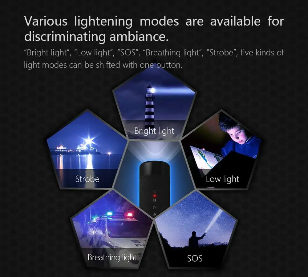 “Bright light”, “Low light”, “SOS”, “Breathing light”, “Strobe”, five kinds of light modes can be shifted with one button.