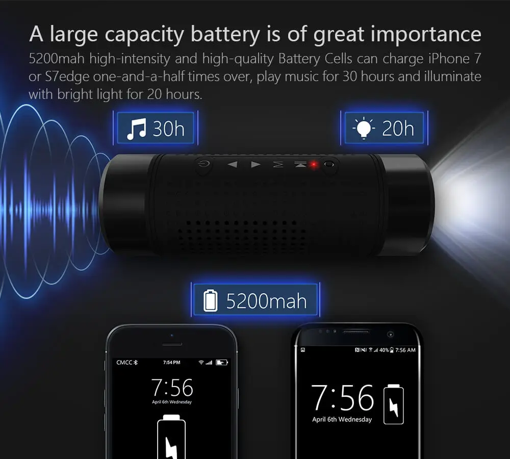 5200mah high-intensity and high-quality Battery Cells can charge iPhone 7, or S7edge one-and-a-half times over, play music for 30 hours and illuminate with bright light for 20 hours.